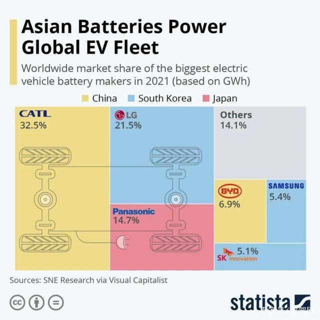 而據(jù)調(diào)研機構(gòu)SNE公布的數(shù)據(jù),寧德時代在2021年的動力電池市場占有率為32.5%,位居第一,LG新能源的市場占有率為21.5%,位居第二。