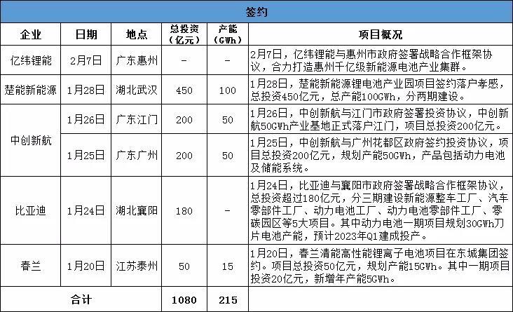 與此同時(shí),多個(gè)動(dòng)力電池項(xiàng)目也在春節(jié)前后紛紛簽約落地。尤為吸引關(guān)注的是中創(chuàng)新航在廣州、江門連下兩城,合計(jì)規(guī)劃建設(shè)100GWh動(dòng)力及儲(chǔ)能電池項(xiàng)目;億緯鋰能與惠州市政府合力打造千億級(jí)新能源產(chǎn)業(yè)集群;比亞迪第17個(gè)產(chǎn)業(yè)基地落戶襄陽。