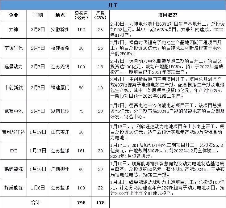 巨大的產(chǎn)能交付疊加確定性市場(chǎng)訂單驅(qū)動(dòng)下,頭部動(dòng)力電池企業(yè)擴(kuò)產(chǎn)項(xiàng)目消息頻傳,包括寧德時(shí)代、中創(chuàng)新航、遠(yuǎn)景動(dòng)力、力神、吉利欣旺達(dá)、SKI、鵬輝能源等動(dòng)力電池企業(yè)在新年伊始紛紛宣布開工。