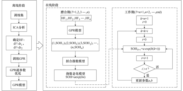 該方法分為離線與在線兩個(gè)階段。在離線階段,通過(guò)電池容量增量分析,提取與SOH相關(guān)性較高的兩個(gè)電壓升片段下所耗的時(shí)間dV-dt1與dV-dt2作為外部健康特征,并使用高斯過(guò)程回歸的方法對(duì)電池SOH的衰退進(jìn)行建模。將在線階段分為兩部分,在“磨合期”通過(guò)GPR模型對(duì)電池前部分周期的SOH進(jìn)行預(yù)測(cè),利用預(yù)測(cè)所得數(shù)據(jù)擬合指數(shù)模型,得到指數(shù)模型參數(shù)的初值;在“工作期”使用指數(shù)模型進(jìn)行SOH預(yù)測(cè),并利用觀測(cè)器每隔固定循環(huán)次數(shù)對(duì)指數(shù)模型的參數(shù)進(jìn)行修正。