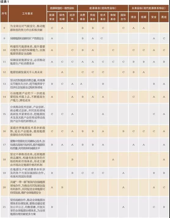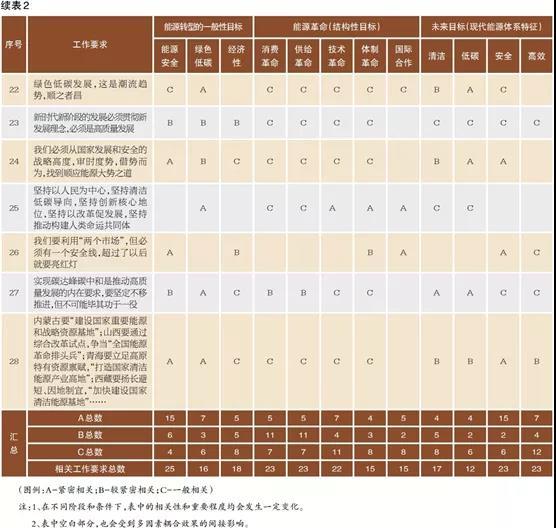 由表可見,在能源革命五個(gè)方面中,與能源“消費(fèi)革命”“供給革命”和“技術(shù)革命”“體制革命”“國(guó)際合作”直接相關(guān)的工作要求分別有23項(xiàng)、23項(xiàng)和22項(xiàng)、15項(xiàng)、15項(xiàng)。可見,涉及能源“消費(fèi)革命”“供給革命”和“技術(shù)革命”的工作要求占比大體相當(dāng),也體現(xiàn)出深化能源領(lǐng)域供給側(cè)結(jié)構(gòu)性改革的重要性,更體現(xiàn)出科技賦能生產(chǎn)生活方式和重點(diǎn)用能領(lǐng)域綠色高效轉(zhuǎn)型的重要性。