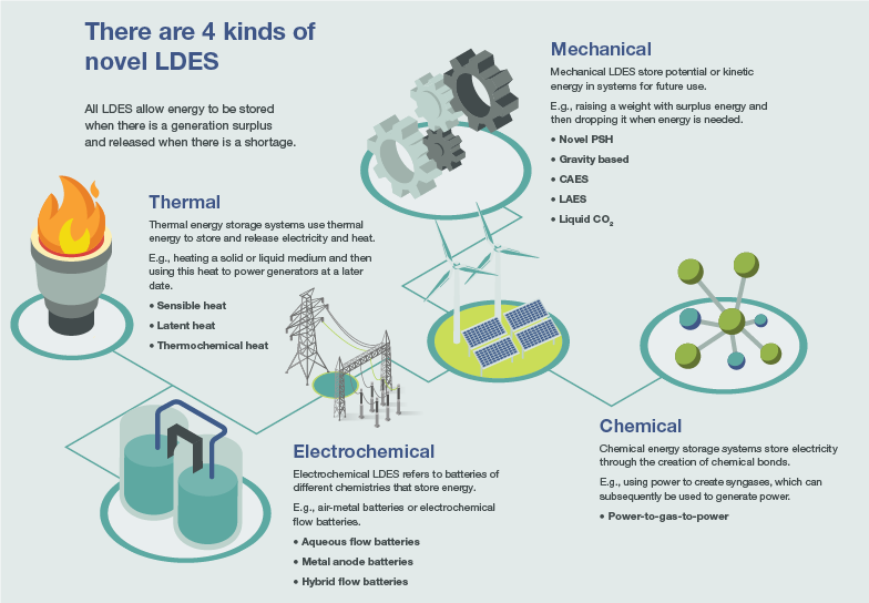 長(zhǎng)時(shí)儲(chǔ)能(LDES)系統(tǒng)被定義為任何可以競(jìng)爭(zhēng)性部署以長(zhǎng)期存儲(chǔ)能源的技術(shù),并且可以經(jīng)濟(jì)可能地?cái)U(kuò)大規(guī)模以維持?jǐn)?shù)小時(shí)、數(shù)天甚至數(shù)周的電力供應(yīng),并為脫碳做出重大貢獻(xiàn)。而存儲(chǔ)能量可以通過(guò)多種不同的方法來(lái)實(shí)現(xiàn),其中包括機(jī)械儲(chǔ)能、熱儲(chǔ)能、電化學(xué)儲(chǔ)能或化學(xué)儲(chǔ)能等。
