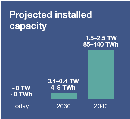 這只是一個(gè)開(kāi)始:建模表明,到2040年,在全球各地部署的長(zhǎng)時(shí)儲(chǔ)能的裝機(jī)容量可能為1.5TW到2.5TW;或者是目前部署的總儲(chǔ)能容量的8到15倍,到2040年將達(dá)到85Wh~140TWh。存儲(chǔ)的電力將高達(dá)全球發(fā)電量的10%。這計(jì)劃著全球到2040年將累計(jì)投資1.5萬(wàn)億美元至3萬(wàn)億美元,潛在價(jià)值創(chuàng)造為1.3萬(wàn)億美元。