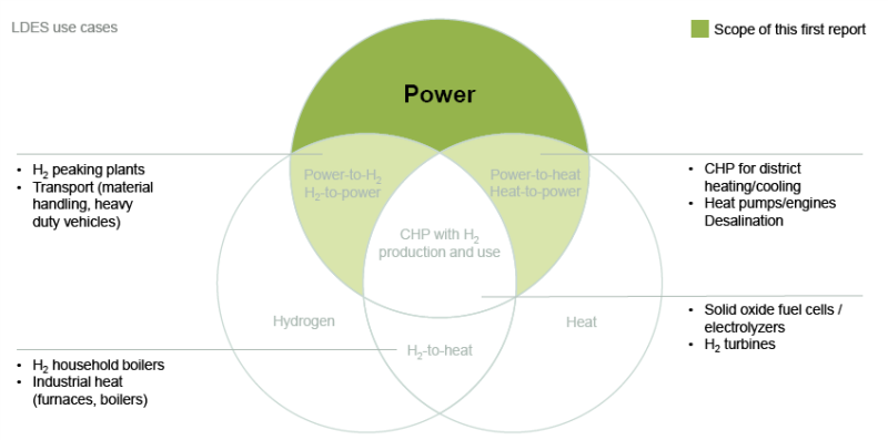基于氫氣的儲(chǔ)能和通過(guò)渦輪機(jī)(以及燃料電池)重新轉(zhuǎn)換為電力可以用于長(zhǎng)時(shí)儲(chǔ)能,但由于在較低的持續(xù)時(shí)間下的成本性能不同,因此在報(bào)告中單獨(dú)提及。