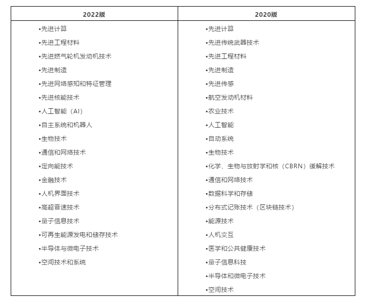 附表1:美國2022年版與2020年版關(guān)鍵和新興技術(shù)清單領(lǐng)域?qū)φ毡?