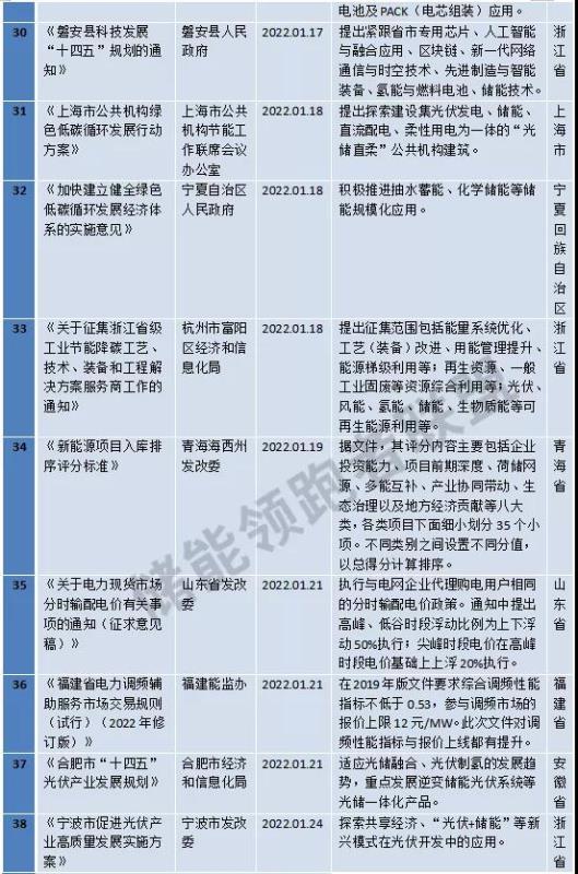 2022年1月4日,安徽省發(fā)改委發(fā)布《安徽省實施長三角一體化發(fā)展規(guī)劃“十四五”行動方案》,提出能源保供,積極爭取“外電入皖”,規(guī)劃建設(shè)長三角皖北可再生能源生產(chǎn)基地和皖南綠色儲能基地,研究建立華東電網(wǎng)抽水蓄能共建共享機(jī)制,加強(qiáng)區(qū)域電力安全互濟(jì)互助。計劃開工阜陽氫能高效智能綜合利用產(chǎn)業(yè)基地等重大項目,計劃制定推動長三角垃圾焚燒發(fā)電市場化運營實施方案,計劃出臺長三角各省市加強(qiáng)應(yīng)急備用調(diào)峰電源能力建設(shè)實施方案和堅強(qiáng)電網(wǎng)保障指導(dǎo)意見等。