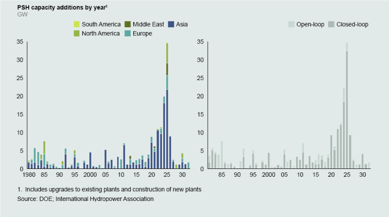 大型抽水蓄能發(fā)電設(shè)施可以提供低成本、可調(diào)度的電力,并且由于其快速響應(yīng)時(shí)間而作為電網(wǎng)穩(wěn)定性的主要解決方案。它的主要限制是缺乏可用場地、交貨時(shí)間長、建設(shè)成本高以及環(huán)境問題。盡管如此,它仍有潛力滿足日益增長的電氣化需求和對零碳能源的需求,并促進(jìn)難以減排的行業(yè)脫碳,特別是在擁有大部分未開發(fā)自然潛力且電力需求可能成倍增加的新興經(jīng)濟(jì)體中。