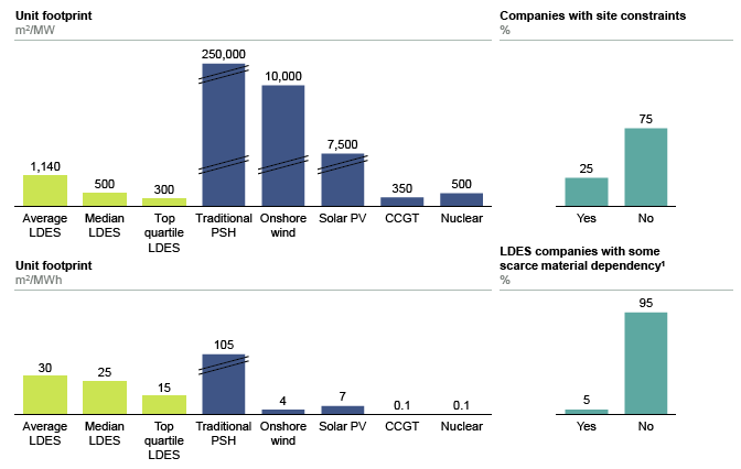 大多數(shù)新興的長時(shí)儲能技術(shù)幾乎沒有部署限制(如圖8所示)。例如,這些長時(shí)儲能系統(tǒng)沒有特定的地理位置要求,并且每個(gè)裝機(jī)容量的占地面積較小。根據(jù)長時(shí)儲能技術(shù)的不同特點(diǎn),有些長時(shí)儲能系統(tǒng)可以建在地下或非??拷丝诔砻艿牡貐^(qū),因?yàn)樗鼈兊陌踩L(fēng)險(xiǎn)低。