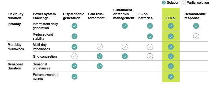 對季節(jié)性靈活性的需求源于太陽輻射、風(fēng)速、溫度和降雨在數(shù)周和數(shù)月內(nèi)的自然變化,以及潛在的極端天氣事件。電網(wǎng)強(qiáng)化、可再生能源超大規(guī)模和棄電、可調(diào)度資產(chǎn),包括氫氣、沼氣以及天然氣可以滿足這些需求。長時(shí)儲能系統(tǒng)也可以這些需求,同時(shí)還能在面對極端天氣條件時(shí)提供彈性。