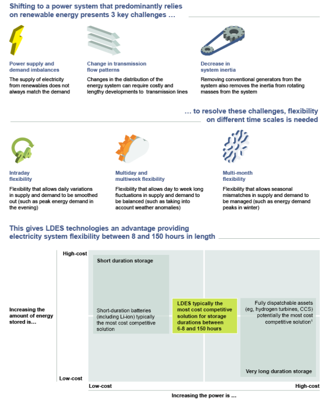 持續(xù)時(shí)間將從12小時(shí)延伸到持續(xù)數(shù)天或數(shù)周。需要解決長期不平衡的可再生能源輸出或由輸電限制引起的潛在中斷。傳統(tǒng)上,電力系統(tǒng)依賴于傳統(tǒng)發(fā)電廠、電力供應(yīng)縮減和輸電網(wǎng)規(guī)模的擴(kuò)張。長時(shí)儲能技術(shù)是一種有前途的零碳解決方案,可以滿足這些長期靈活性需求,尤其是那些持續(xù)數(shù)天的電力需求。