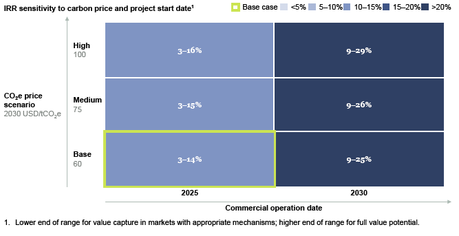 本案例的經(jīng)濟性對碳減排價格和項目開始的日期很敏感。當商業(yè)運營日期移至2030年時,內(nèi)部收益率(IRR)將顯著增加至9%至25%,而長時儲能系統(tǒng)的建設(shè)將在前兩年進行。此外,加速碳減排價格上漲可能導(dǎo)致內(nèi)部收益率高達16%和29%,其運營日期分別為2025年和2030年(如圖33所示)。