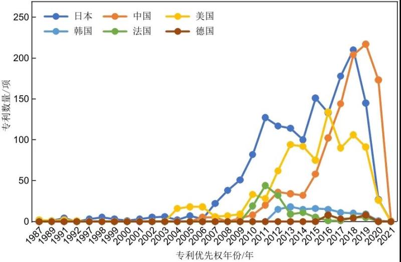 圖7 全球全固態(tài)鋰電池技術(shù)主要優(yōu)先權(quán)國(guó)家或地區(qū)發(fā)展趨勢(shì)