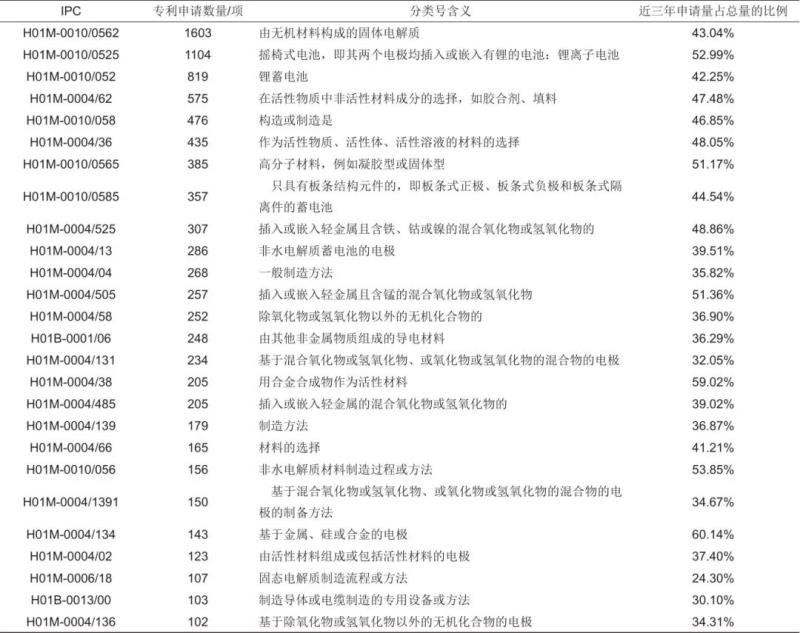 國(guó)際專利分類(IPC)是國(guó)際通用的、標(biāo)準(zhǔn)化的專利技術(shù)分類體系,蘊(yùn)含著豐富的專利技術(shù)信息。通過(guò)對(duì)全固態(tài)鋰電池技術(shù)專利的IPC進(jìn)行統(tǒng)計(jì)分析,可以準(zhǔn)確、及時(shí)地獲取該領(lǐng)域涉及的主要技術(shù)主題和研發(fā)重點(diǎn)。本次分析的2841項(xiàng)專利中共涉及838個(gè)IPC分類號(hào)。全固態(tài)鋰電池技術(shù)專利申請(qǐng)量大于100項(xiàng)的IPC分類號(hào)及其申請(qǐng)情況(如表2所示),可以看出,分布式能源技術(shù)專利申請(qǐng)主要集中在以下方面。