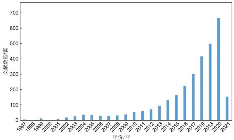 本次分析利用Web of Science數(shù)據(jù)庫(kù)檢索獲得了全球全固態(tài)鋰電池技術(shù)相關(guān)文獻(xiàn)數(shù)據(jù)集,Web of Science數(shù)據(jù)庫(kù)采集時(shí)間段為1900—2021年,共得到相關(guān)文獻(xiàn)數(shù)量3120篇。