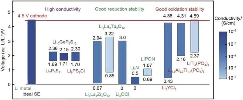 其中電解質(zhì)界面穩(wěn)定性對(duì)全固態(tài)鋰電池長(zhǎng)循環(huán)壽命至關(guān)重要。不同電解質(zhì)氧化和還原極限如圖2所示。目前還沒(méi)有一種電解質(zhì)材料既具有高氧化極限又具有低還原極限。