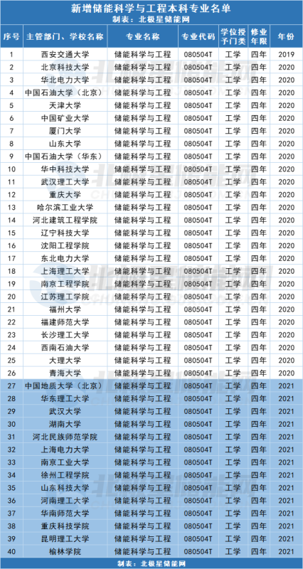 2020年1月,教育部、國(guó)家發(fā)展改革委、國(guó)家能源局聯(lián)合發(fā)布了《儲(chǔ)能技術(shù)專業(yè)學(xué)科發(fā)展行動(dòng)計(jì)劃(2020—2024年)》,計(jì)劃經(jīng)過(guò)5年左右努力,增設(shè)若干儲(chǔ)能技術(shù)本科專業(yè)、二級(jí)學(xué)科和交叉學(xué)科,完善儲(chǔ)能技術(shù)人才培養(yǎng)專業(yè)學(xué)科體系,在京津冀、東北、長(zhǎng)江經(jīng)濟(jì)帶、長(zhǎng)三角、西北等地區(qū)布局建設(shè)儲(chǔ)能技術(shù)、儲(chǔ)能材料、儲(chǔ)能管理等新專業(yè)。隨后,教育部2019年度普通高等學(xué)校本科專業(yè)備案和審批中首次設(shè)立“儲(chǔ)能科學(xué)工程”新專業(yè)、專業(yè)代碼080504T(T代表特設(shè)專業(yè)),當(dāng)年僅有西安交通大學(xué)增設(shè)了該專業(yè)。2021年3月1日,在2020年度本科專業(yè)備案和審批中,又有北京科技大學(xué)、華北電力大學(xué)、中國(guó)石油大學(xué)、華中科技大學(xué)、武漢理工大學(xué)、哈爾濱工業(yè)大學(xué)、東北電力大學(xué)、福建師范大學(xué)、長(zhǎng)沙理工大學(xué)、青海大學(xué)等等共25所高校增設(shè)了“儲(chǔ)能科學(xué)與工程”專業(yè)。截至目前,設(shè)置儲(chǔ)能專業(yè)的院校共計(jì)達(dá)到40所!