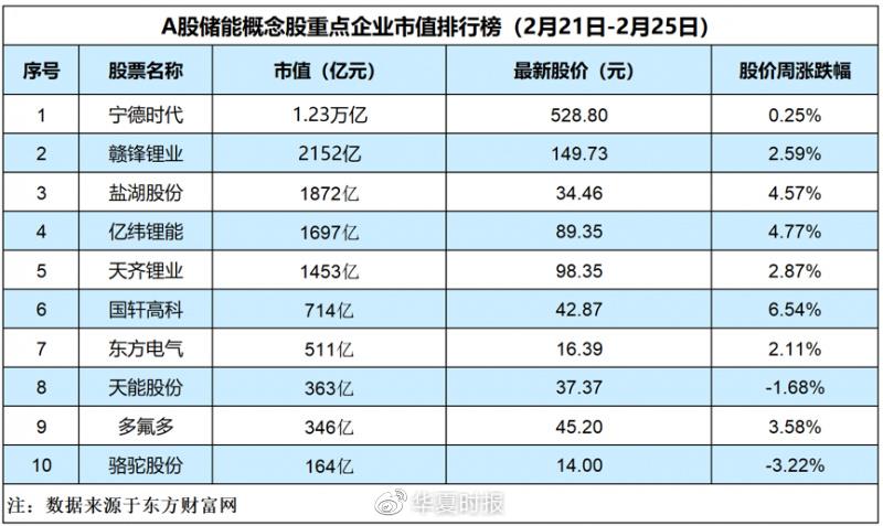 中國儲能網(wǎng)訊:本周(2月21日-2月25日)東方財富儲能概念板塊整體上漲2.57%。《華夏時報》記者重點監(jiān)測的10家儲能企業(yè),除駱駝股份、天能股份兩家下跌外,其余全部收漲。