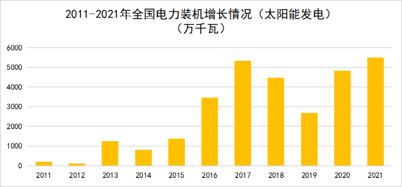 2021年,全國(guó)水電、火電、核電、風(fēng)電、光伏的裝機(jī)容量分別新增2349、4628、340、4757和5493萬(wàn)千瓦,合計(jì)17629萬(wàn)千瓦。