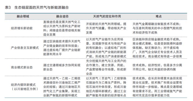 天然氣與新能源的生態(tài)鏈層面融合,是指天然氣突破現有的商業(yè)生態(tài)和盈利模式,發(fā)掘新的潛力,提供新的產品和服務,在促進碳中和方面發(fā)揮新的作用,主要體現在經濟增長新動能、產業(yè)信息交互新模式、商業(yè)模式新業(yè)態(tài)、經濟內循環(huán)新模式幾個方面(見表3)。