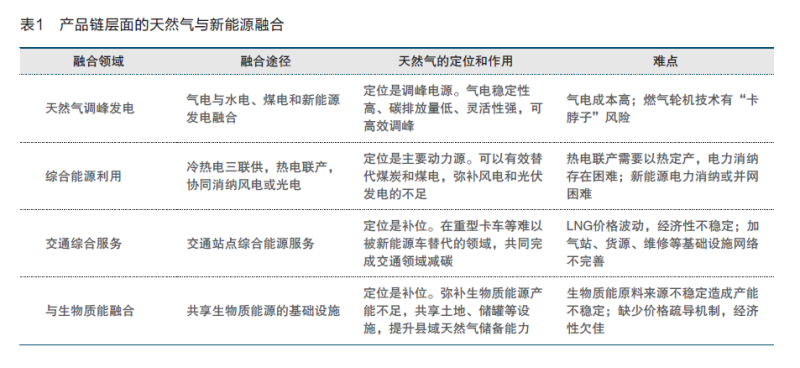 天然氣與新能源在產品鏈層面的融合,是指天然氣與多種能源產品互補,開拓單一能源產品無法高效開發(fā)的潛在市場,主要集中在電力領域的天然氣調峰發(fā)電、工業(yè)領域的綜合能源利用、交通領域的“油氣電氫服”綜合能源站建設和生物質能幾個方面(見表1)。