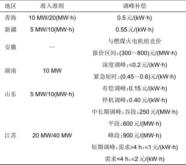 表2 典型地區(qū)儲(chǔ)能參與調(diào)峰補(bǔ)償標(biāo)準(zhǔn)