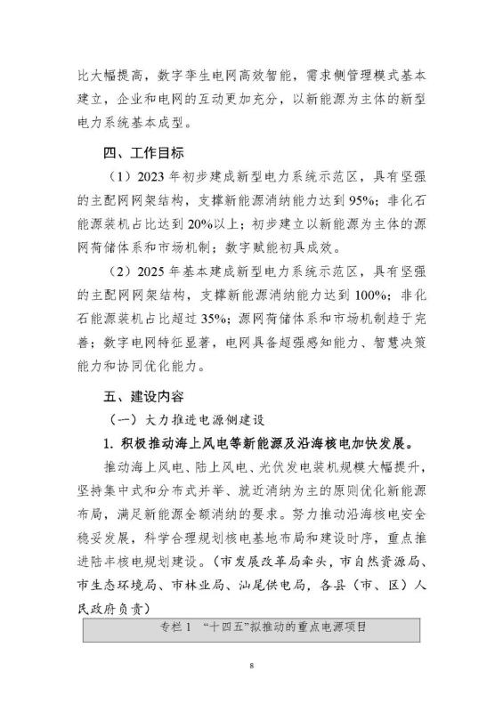 方案中提出2023年初步建成新型電力系統示范區(qū),具有堅強的主配網網架結構,支撐新能源消納能力達到95%;非化石能源裝機占比達到20%以上;初步建立以新能源為主體的源網荷儲體系和市場機制;數字賦能初具成效。2025年基本建成新型電力系統示范區(qū),具有堅強的主配網網架結構,支撐新能源消納能力達到100%;非化石能源裝機占比超過35%;源網荷儲體系和市場機制趨于完善;數字電網特征顯著,電網具備超強感知能力、智慧決策能力和協同優(yōu)化能力。