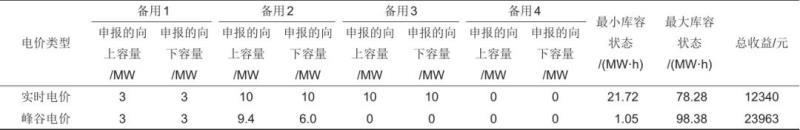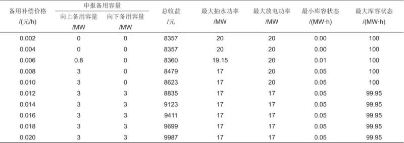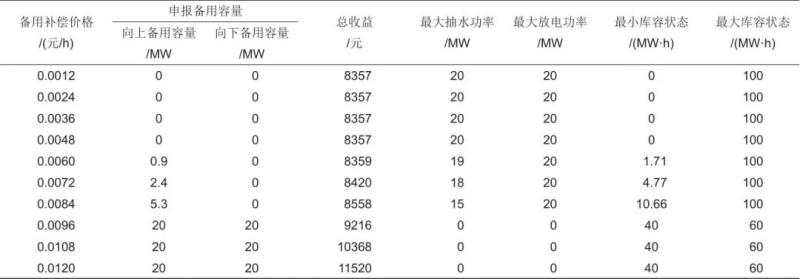 當(dāng)僅考慮抽蓄電站提供一種備用時(shí),例如只提供一次調(diào)頻備用、持續(xù)時(shí)間不低于一分鐘(備用類型1),并設(shè)備用容量上限為3 MW,在不同備用補(bǔ)償價(jià)格下,抽蓄電站申報(bào)的備用容量與收益等情況如表1所示。當(dāng)備用補(bǔ)償價(jià)格較低時(shí),抽蓄電站仍然將所用容量用于參與電能量市場,當(dāng)備用補(bǔ)償價(jià)格高于0.012元/h時(shí),抽蓄電站會(huì)盡可能將容量用于提供備用,從而獲得更多收益,該價(jià)格下,抽蓄電站總收益可達(dá)8835元,高于電能市場中的總期望收益,即為8357元。與僅參與電能市場情況相比,提供備用后的總期望收益增加5.72%。
