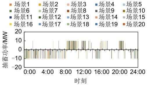 當(dāng)不考慮抽蓄提供備用時(shí),其在不同電價(jià)場景下的抽水、發(fā)電情況如圖3所示。每個(gè)時(shí)段上均有20個(gè)柱狀線,代表該時(shí)段上,各個(gè)場景下的抽蓄的運(yùn)行功率大小,不同場景用不同顏色區(qū)分,且負(fù)值表示抽水功率,即運(yùn)行于蓄水狀態(tài);正值表示發(fā)電功率,即運(yùn)行與發(fā)電狀態(tài)。仿真結(jié)果顯示:抽蓄電站主要在夜間抽水,中午和傍晚負(fù)荷電價(jià)較高時(shí)段發(fā)電,從而利用不同時(shí)段上的電價(jià)差異獲利,一天內(nèi)的總獲利期望為8357元。一天內(nèi)出現(xiàn)的最大抽水功率和放電功率均為20 WM,蓄水容量最大、最小狀態(tài)限分別是100和0 MW·h,說明抽蓄電站容量得到了完全利用。抽蓄電站的獲利情況主要與一天內(nèi)不同時(shí)段間的電價(jià)差異有關(guān),電價(jià)差超過一定水平時(shí),抽蓄電站便會(huì)充分利用其容量獲得收益。