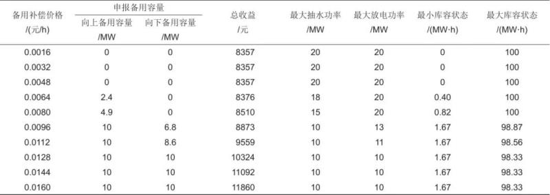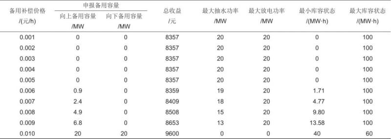 抽蓄電站提供備用的成本主要來自于電能市場中的機(jī)會(huì)成本,只有當(dāng)備用補(bǔ)償價(jià)格高于電能量市場中的機(jī)會(huì)成本時(shí),抽蓄電站才開始提供備用容量。計(jì)算結(jié)果表明:抽蓄電站提供的備用容量隨著補(bǔ)償價(jià)格的升高而增加,說明其所提供的備用容量在電能量市場中的機(jī)會(huì)成本也越來越大??梢?,抽蓄電站的運(yùn)行需要根據(jù)電能量市場中的收益和備用補(bǔ)償價(jià)格進(jìn)行決策,從而獲得最大收益。