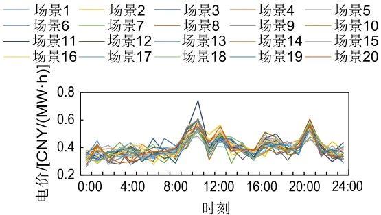參考實(shí)際抽水蓄能電站參數(shù)和我國河南省電價(jià)水平,本工作對相關(guān)算例參數(shù)進(jìn)行了假設(shè),設(shè)抽蓄電站的參數(shù)如下:最大放電功率和最大抽水功率為20 MW,庫存容量為100 MW·h,抽水蓄能電站的效率為75%。本研究所采用的多場景能量電價(jià)曲線如圖2所示,該電價(jià)場景是通過模擬我國某省電能量市場運(yùn)行情況所得。整體上,夜間系統(tǒng)凈負(fù)荷(即系統(tǒng)負(fù)荷功率減去風(fēng)、光出力)相對較低,因此,各場景下電價(jià)也相對較低;中午和傍晚系統(tǒng)凈負(fù)荷相對較高,因此,各場景下電價(jià)相對較高。本文建立的模型為混合整數(shù)線性規(guī)劃模型,采用MATLAB編寫程序,并調(diào)用CPLEX優(yōu)化求解器完成了問題求解。