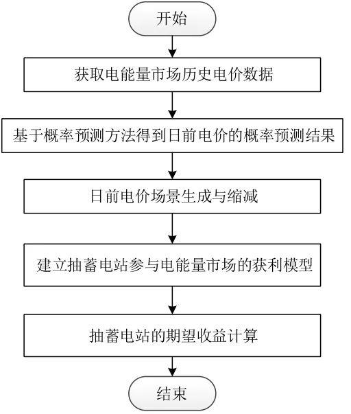 抽水蓄能在電能量市場中利用峰谷價(jià)差獲利,在日前電力市場環(huán)境下,考慮抽蓄作為獨(dú)立主體參與市場,其收益情況與日前出清電價(jià)曲線密切相關(guān)。本研究考慮電能量市場日前電價(jià)的不確定性,建立抽蓄電站的收益分析模型,建模流程如圖1所示。
