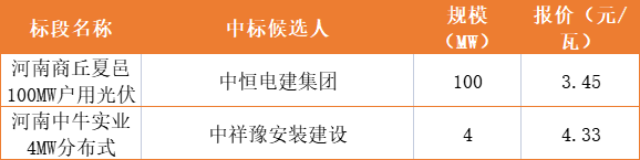 河南整縣項目分為100MW戶用光伏與4MW分布式項目,其中戶用光伏項目中標企業(yè)為中恒電建,報價3.45元/瓦,分布式項目則報價相對較高,達到了 4.33元/瓦。