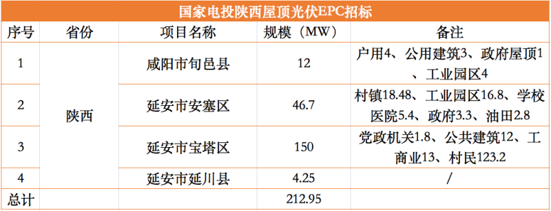 陜西4縣項目分別為咸陽市旬邑縣、延安市安塞區(qū)、寶塔區(qū)、延川縣,其規(guī)??傆嫗?13MW。各縣項目又分別就政府屋頂、公用建筑屋頂、工業(yè)園區(qū)/彩鋼瓦、戶用光伏等四類不同類型屋頂明確了具體的規(guī)模。