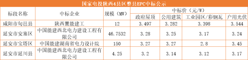 從中標結(jié)果來看,國家電投陜西4縣整縣光伏項目的中標人基本為中國能建旗下企業(yè),僅旬邑縣標段由陜西置能建工中標。