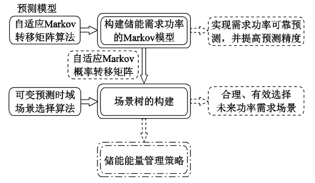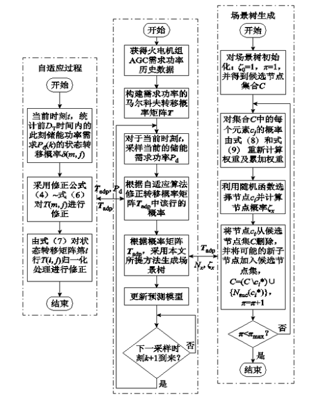 他們首先針對(duì)火電機(jī)組響應(yīng)AGC指令時(shí)功率隨機(jī)變化且難以實(shí)時(shí)監(jiān)測(cè)的問(wèn)題,采用馬爾科夫鏈建立儲(chǔ)能需求功率模型,并針對(duì)AGC指令周期性波動(dòng)的特點(diǎn),采用后驗(yàn)信息實(shí)時(shí)自適應(yīng)調(diào)整Markov轉(zhuǎn)移概率矩陣以提高預(yù)測(cè)精度。然后,針對(duì)隨機(jī)場(chǎng)景繁多的問(wèn)題,提出一種可變預(yù)測(cè)時(shí)域的場(chǎng)景樹生成方法。該方法能夠在樹節(jié)點(diǎn)規(guī)模一定的前提下更有效地選擇預(yù)測(cè)場(chǎng)景。最后,通過(guò)算例分析了所提自適應(yīng)預(yù)測(cè)模型的準(zhǔn)確性。結(jié)果表明,所提模型能夠?yàn)閮?yōu)化能量管理策略提供更有效、可靠的功率預(yù)測(cè)信息。