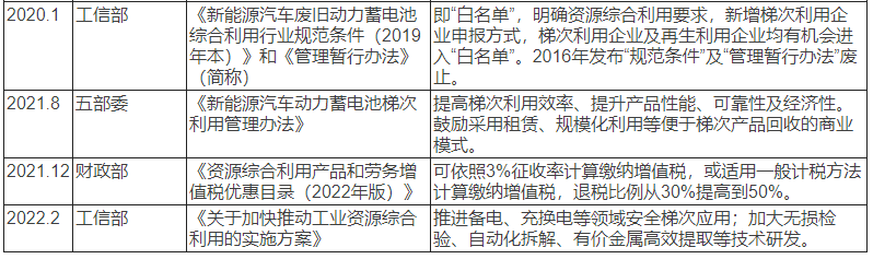 與“白名單”同期,我國密集出臺動力電池回收相關政策,提出行業(yè)規(guī)范,從明確車企承擔回收主體責任,開展電池回收試點工作,建立溯源管理平臺,回收網(wǎng)點建設指導,修改行業(yè)規(guī)范增加梯次利用企業(yè)申報,到鼓勵梯次模式創(chuàng)新,推出一系列指導政策。