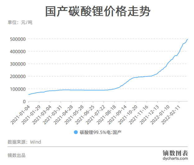 碳酸鋰價(jià)格從年初30萬元/噸到現(xiàn)在的50萬元/噸,一個(gè)季度的時(shí)間都沒用完。在碳酸鋰價(jià)格走勢(shì)圖中,價(jià)格曲線已近乎45度斜角的態(tài)勢(shì)爬升,幾乎很難見到如此凌厲的漲價(jià)走勢(shì)。
