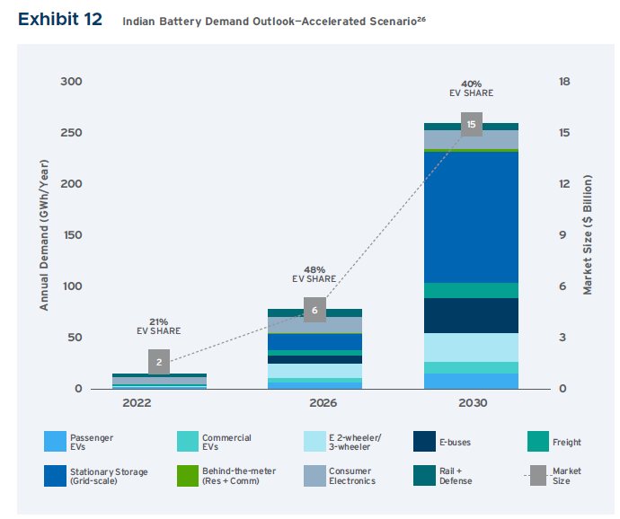 印度在先進電池技術制造方面的影響力如今微不足道。然而,該國擁有大規(guī)模電池制造的巨大潛力。報告指出,到2030年,印度的電池市場可能超過150億美元(約合1.12萬億盧比),到2030年,印度的電池需求預計將在“加速情景”中上升到260GWh。