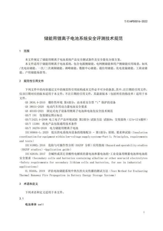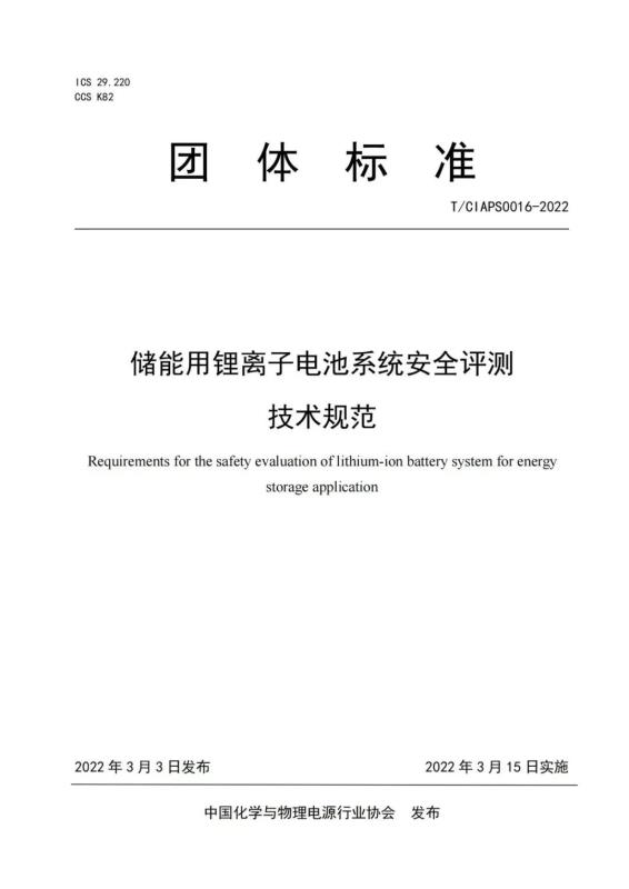 中國(guó)化學(xué)與物理電源行業(yè)協(xié)會(huì)批準(zhǔn)發(fā)布《儲(chǔ)能用鋰離子電池系統(tǒng)安全評(píng)測(cè)技術(shù)規(guī)范》(T/CIAPS0016―2022)標(biāo)準(zhǔn),現(xiàn)予公告。