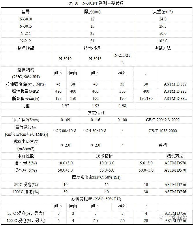 科潤新材料成立于2019年,成立時間雖短但其技術(shù)團隊經(jīng)過數(shù)十年研發(fā)實現(xiàn)了全氟磺酸質(zhì)子膜的自主化生產(chǎn),目前科潤100萬平米質(zhì)子交換膜項目也已開工。其開發(fā)的全氟離子膜已在燃料電池、釩電池、電解水制氫等領(lǐng)域得到了廣泛應(yīng)用,并為我國釩電池行業(yè)提供了90%以上的國產(chǎn)全氟離子膜產(chǎn)品??茲櫺虏牧贤ㄟ^鋼帶流延法實現(xiàn)了全氟離子膜的批量化生產(chǎn),目前主要產(chǎn)品包括N-11系列、N-21系列、N-21C系列、N-41系列、N-51系列、N-301PT,其中面向燃料電池與液流電池的主要是N-11系列、N-21系列、N-21C系列以及N-301PT,下表為部分產(chǎn)品主要參數(shù)。其中N-301PT是利用ePTFE微孔增強材料生產(chǎn)的復(fù)合全氟磺酸 H型質(zhì)子交換膜,最薄可達12μm,在國內(nèi)具有較強的競爭力。
