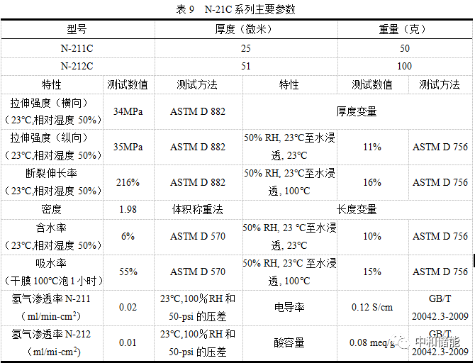 為適應(yīng)燃料電池業(yè)務(wù)發(fā)展的需求,杜邦旗下科慕化學于2015年獨立上市,目前的Nafion全氟磺酸膜是通過與聚四氟乙烯共聚而成的聚合膜。目前杜邦公司主要產(chǎn)品為D520/521、D1020/1021、D2020/2021、N1110、N115以及N117等,其中應(yīng)用于燃料電池領(lǐng)域的是通過溶液澆鑄法制成的NR211和NR212,其膜厚分別為50μm和100μm,目前市場競爭力有限,但在杜邦公司的長久Nafion膜研究積累以及全氟磺酸樹脂的絕領(lǐng)先優(yōu)勢下,前景依然可觀。其Nafion系列全氟磺酸樹脂的主要參數(shù)如下表。目前科慕在中國售賣的主要產(chǎn)品為N115和N117,其零售價為13500元/平方米和15000-19000元/平方米,其燃料電池質(zhì)子交換膜在國內(nèi)銷售較為鮮見。