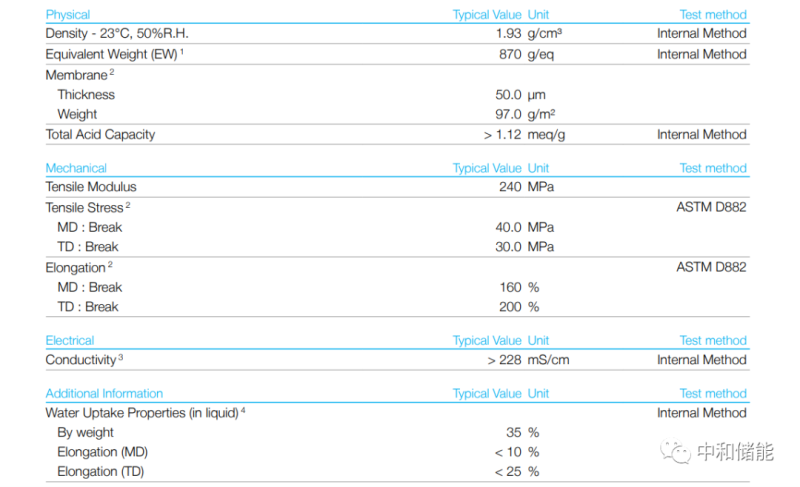 蘇威公司的全氟磺酸質(zhì)子膜在2008年將名稱由Hyflon Ion改為商標名Aquivion,其生產(chǎn)方式為熔融擠出。2008年之前主要生產(chǎn)E83型號,2008年后公司推出了以膜交換容量分別為1.14 mmol/g和1.26 mmol/g的E87和E79為主,厚度分別有30,50和100μm。目前,蘇威主要生產(chǎn)的Aquivion型號為E87-05、E98-05、E98-05S以及E98-09S可在燃料電池和制氫領(lǐng)域應(yīng)用。其E87-05主要參數(shù)如下表,目前在國內(nèi)蘇威市場不大,幾乎沒有相關(guān)價格。