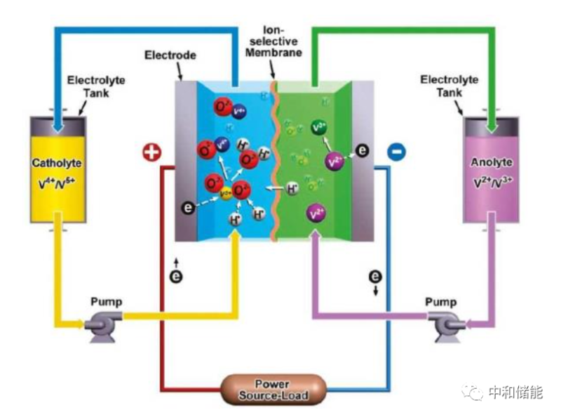 以全釩氧化還原液流電池為例,其電池反應(yīng)式為: