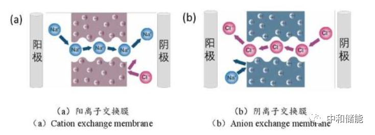 離子交換膜是液流電池和燃料電池裝置的重要結(jié)構(gòu)部件,這種帶有離子基團的高分子薄膜材料通過選擇性透過離子從而實現(xiàn)電池結(jié)構(gòu)中完整回路的構(gòu)建。目前,離子交換膜根據(jù)所帶有的不同功能基團,可以被主要分為陽離子交換膜與陰離子交換膜兩類。陽離子交換膜主要是帶有荷負電的磺酸根基團用于陽離子的傳遞,如傳遞H+的質(zhì)子交換膜。陽離子交換膜上的負電基團會形成強大的負電場,從而對質(zhì)子產(chǎn)生吸引作用使其通過隔膜,并對陰離子產(chǎn)生排斥作用將其截留;陰離子交換膜則主要是帶有荷正電的基團(包括季銨鹽、咪唑鹽、季膦鹽等),其形成的正電場吸引OH-從而實現(xiàn)電解液中OH-離子的傳遞,而阻攔陽離子的通過,其示意圖如下[1]。