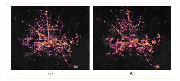圖1 美國(guó)得克薩斯州休斯頓市在2021 年2 月停電之前(a)和停電期間(b)的衛(wèi)星圖像顯示,該市大片地區(qū)斷電。在危機(jī)期間,該市約有100 萬(wàn)人在某些時(shí)間用不上電,至少有31 人死于暴風(fēng)雪相關(guān)原因。來(lái)源:National Aeronautics and Space Administration Earth Observatory(公共領(lǐng)域)