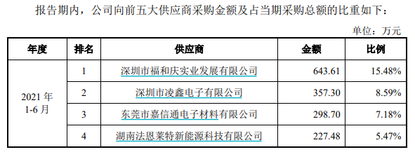與同行業(yè)可比公司有所不同的是,華慧能源所生產(chǎn)的電容式鋰離子電池最大應(yīng)用領(lǐng)域為智能玩具,2018年-2020年及2021年1月-6月(以下簡稱報告期),公司前五大客戶有較多國內(nèi)外玩具廠商且名單相對穩(wěn)定,而前五大供應(yīng)商名單則變動頻繁。