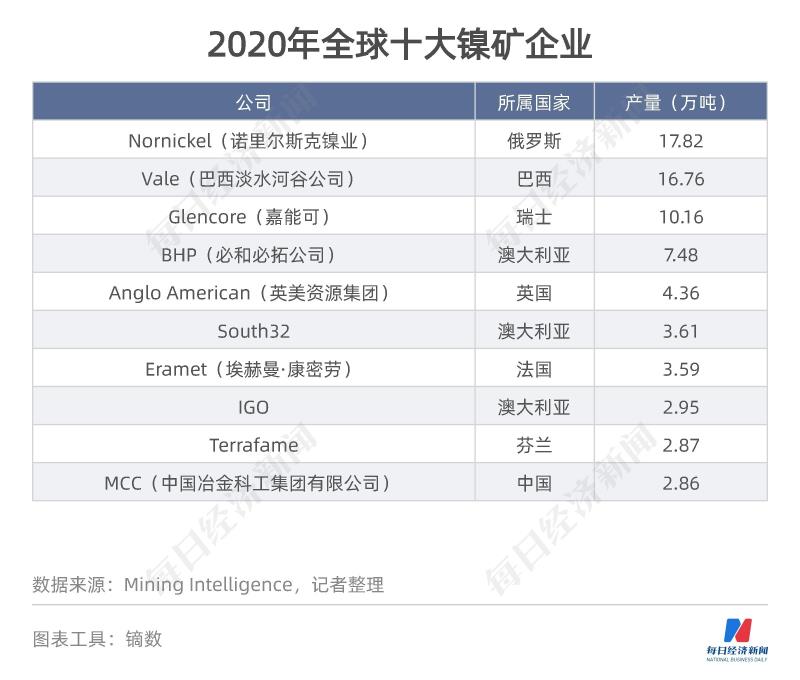 根據(jù)Mining Intelligence數(shù)據(jù),2020年排名全球前三的鎳礦公司分別是諾里爾斯克鎳業(yè)、巴西淡水河谷公司和嘉能可,它們分別來自俄羅斯、巴西和瑞士。