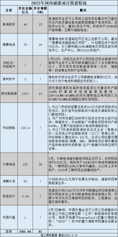 除大額訂單簽約落地,眾多企業(yè)也將目光鎖定在了投擴(kuò)建儲(chǔ)能賽道上。據(jù)高工鋰電不完全統(tǒng)計(jì),開年以來(lái),國(guó)內(nèi)投擴(kuò)建儲(chǔ)能項(xiàng)目涉及金額達(dá)540.44億元,涉及規(guī)模超81GWh。