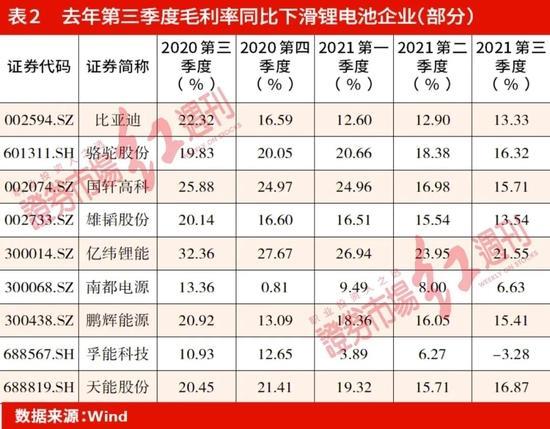 國內某鋰電池企業(yè)相關負責人向《紅周刊》記者表示,去年,包括鋰電池原材料在內的綜合成本增加了40%。事實上,自去年下半年以來,鋰電材料漲價因素對鋰電池企業(yè)的業(yè)績、毛利的影響已經(jīng)開始加劇,這從去年鋰電池企業(yè)三季度的毛利數(shù)據(jù)可以很直觀地看到。如億緯鋰能,毛利率由2020年第三季度的32.36%下降至去年第三季度的21.55%,降幅為33%;國軒高科則由25.88%下降至15.71%,降幅為39%;孚能科技則由10.93%變?yōu)樨撝担ㄒ姳?)。