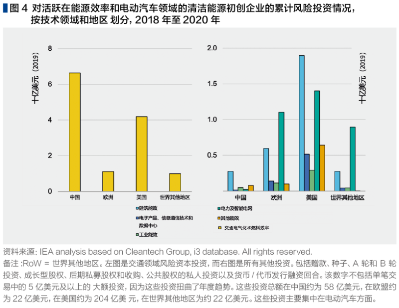 對能源效率和電動出行初創(chuàng)企業(yè)的風險投資集中在世界幾個地方。在2018-2020年期間,總部設在美國的公司吸引了約40%的此類融資,其次是中國(30%)和歐盟(10%)(不包括單輪5億美元或以上的大型交易,因為這些交易可能掩蓋基本趨勢)。在中國和美國,圍繞交通領域電動化的投資活動十分活躍,中國從2015年左右開始受益于有針對性的支持,美國則有一系列超過10億美元的交易記錄。相比之下,建筑、電力和工業(yè)在全球范圍內吸引的能效風險投資要少得多,而且在這些部門實現(xiàn)凈零排放的目標方面還有許多技術創(chuàng)新的差距和機會。